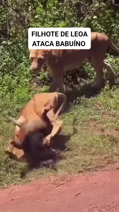 filhote de leoa ataca macaco e m茫e s贸 observa #lion #Macaco #viraliza #mundoanimal