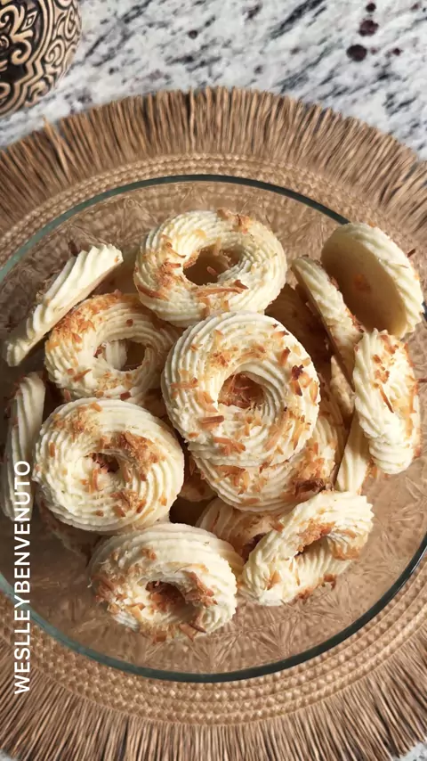 🥥 Petit Four de Coco com Bico de Confeitar 📝 INGREDIENTES • 200 g de amido de milho • 100 g de farinha de trigo • 100 g de açúcar • 183 g de margarina • 70 ml de leite de coco (ou leite integral) • Coco ralado seco (opcional, para polvilhar)