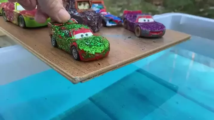 O menino gosta do jogo de carro de corrida McQueen e amigos de carro taxiando na água.