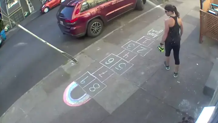 Uma jovem que desenhou uma amarelinha no chão está se divertindo e fazendo muita gente se divertir também na calçada do prédio onde mora. A câmera de segurança do prédio mostra a reação das pessoas que passam e vão pulando nos quadradinhos numerados. São crianças, jovens, adultos, idosos, mulheres e homens inclusive. Todos entram na brincadeira #humor #Notícia
