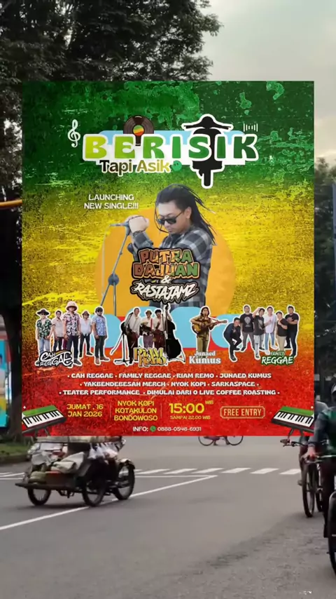 Yuk, merapat ke acara BERISIK TAPI ASIK! Kita rayakan launching single baru PUTRA DAJJAN & RASTAYuk, merapat ke acara BERISIK TAPI ASIK! Kita rayakan launching single baru PUTRA DAJJAN & RASTAJAMZ! Dimeriahkan oleh: Cah Reggae, Family Reggae, Riam Remo, Junaed Kumus, dan kawan-kawan lainnya. Dijamin pecah! Jumat, 16 Januari 2026 | Mulai jam 3 sore. FREE ENTRY di Nyok Kopi, Bondowoso. Ajak teman-temanmu! ✌️#bondowoso_explore#bondowoso#bondowosohitz#bondowosotoday#bondowoso_selebgramhits