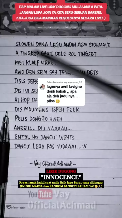 Membalas @nyonyamenir_98 Lirik Dugong Avril Lavigne - Innocence | Yang Ku Dengar #lirikparodi #lirikdugong #liriklagu #gaknyambung #gakmasuk #random #maksa #joinlive #achmadrifai #masvay #vayofficialachmad #lyrics #videolirik #videolyrics #avrillavigne #innocence #avrillavigneinnocence