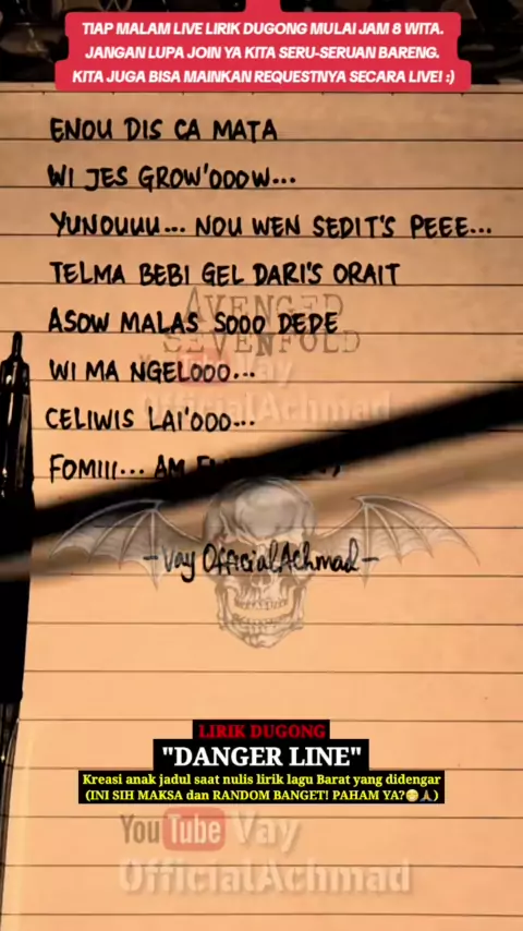 Membalas @introvert0710 Lirik Dugong Avenged Sevenfold - Danger Line | Yang Ku Dengar #lirikparodi #lirikdugong #liriklagu #gaknyambung #gakmasuk #random #maksa #joinlive #achmadrifai #masvay #vayofficialachmad #lyrics #videolirik #videolyrics #avengedsevenfold #dangerline #avengedsevenfolddangerline #a7x #deathbat