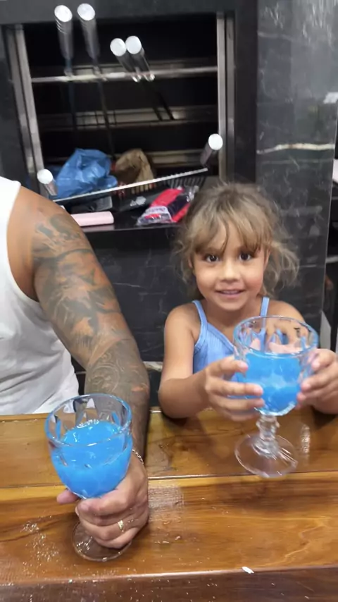 Provando suco do stitch
