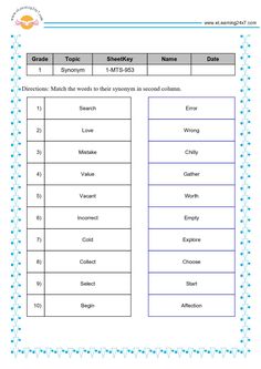 Match Synonyms Worksheets For Grade 1