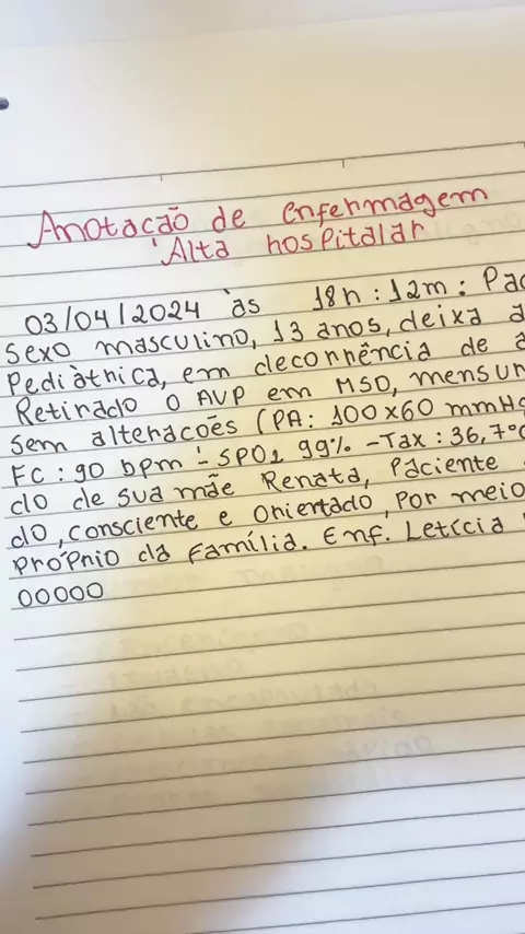Anotação de enfermagem para alta hospitalar 📝 #enfermagem #estudos #resumos
